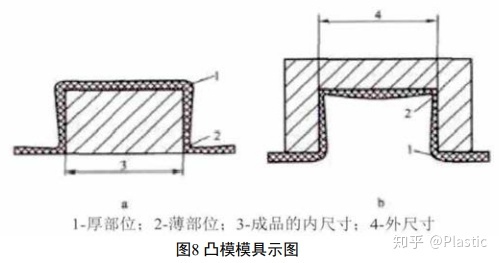 对于凸模成型,制件的内尺寸是很精确的,因为它是与真空吸塑成型工具相接的一面。相反,对于凹模成型,制品的外尺寸是很精确的,因为其外部与真空吸塑成型模具相接触如下图8。