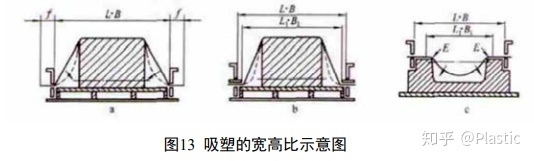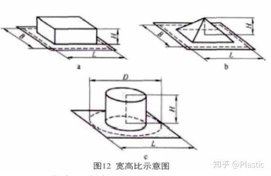 模具宽度与深度的比值通常称为宽高比。一般来说,因为凸模可以对片材有拖拽和预拉伸的作用,所以用凸模成型时的高度可以略微小些,但也不能小于1。用凹模成型时的宽高比通常不小于1.4。如图12所示,图中L是长,B是宽,H是高,D是圆柱直径。