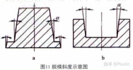 为了能够顺利脱模,模具侧面必须具有一定的倾斜度。在脱模方向上,模具侧面的倾角被称为脱模斜度。脱模斜度应该取得尽可能大,脱模斜度越大,脱模越快,成型周期越短,而且在脱模的过程中制品变形的可能性小,脱模斜度一般大于1度,如图11所示。当然也有企业经过多年的研发,已经突破了0度脱模的吸塑技术难题,为吸塑制品的应用开拓了一条全新的方向。