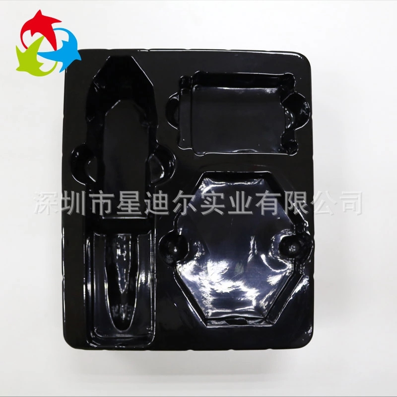 吸塑加工厂采用PET为原材料,经过吸塑工艺热成型后形成的塑料制品,再由刀模冲切出完整的吸塑包装盒。颜色纯黑,与产品形成鲜明对比,便于在销售中的展示,材质环保对环境无污染,是一款“绿色”产品。PET玩具吸塑包装采用内托设计形式,具有很好的抗摔性。