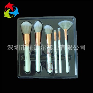 特点:该产品是由吸塑加工厂依据实物产品形状而设计定制的吸塑制品,能够完美跟形产品大小,能够和多款化妆刷贴合度好;化妆刷吸塑盒需用材质环保无公害,可降解性强,对环境无污染;颜色透明,有便于顾客购买时的挑选;化妆刷吸塑盒选用上下盖的设计形式,方便安放和取出,在销售过程中便于展示。
