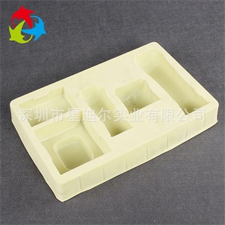 本款产品由拥有一流生产设备、具有十分丰富生产经验的吸塑加工厂依据客户提供的实物以及相关要求而自行设计定做的一款吸塑产品。定制植绒吸塑盒采用环保淡黄色植绒PS片材为原材料,经热加工处理后成型的吸塑内托,能够在保证对环境无公害的同时也便于客户在购买时的挑选。定制植绒吸塑盒独特的设计形式使产品看上去更加美观,与实物产品形成一定的反差,便于吸塑制品在销售中的展示。