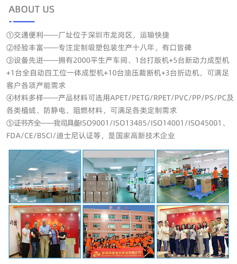 星迪尔位于深圳市龙岗区,具有便利的交通条件,专注吸塑包装生产十八年,具备丰富的生产经验。公司拥有2000平生产车间、1台打版机+5台新动力成型机+1台全自动四工位一体成型机+10台油压裁断机+3台折边机,满足各项产能需求,现生产材料有APET/PETG/PVC/PP/PS/PC及各类植绒、防静电、阻燃材料,能满足各类定制需求。我司具备ISO9001/ISO13485/ISO14001/ISO45001、FDA/CE/BSCI/迪士尼认证,是国家高新技术企业。