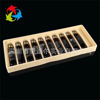 本款产品是依据客户提供的实物以及相关要求而自行设计定做的一款塑料包装制品,采用环保PS植绒片材,在保证对环境无公害的同时也能便于客户在购买时的挑选。口服液吸塑泡壳采用多格装内托设计形式使产品看上去更加美观,便于吸塑泡壳在销售中的展示。