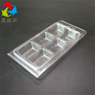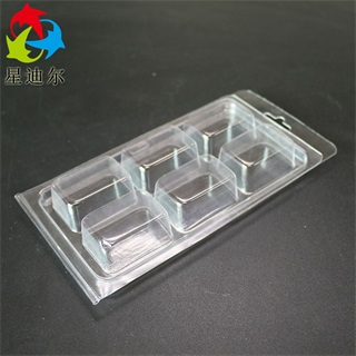 这款石蜡吸塑包装产品采用透明PET为原材料,经过吸塑工艺热成型后形成的塑料制品,再由刀模冲切出完整的吸塑包装盒。颜色透明,便于在销售中的展示,材质环保对环境无污染,是一款“绿色”产品。石蜡吸塑包装采用对折的设计形式,放入实物后加一张印有产品信息的卡纸,经扣位扣紧,节约的成本,也便于吸塑产品的销售和展示。
