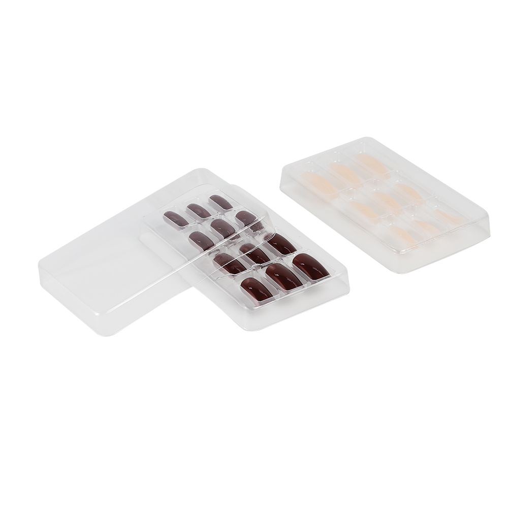 简述:本款吸塑制品是有星迪尔吸塑厂家根据客户实物以及各项要求而定制的,能够装下各种不同大小的假指甲,底加盖的设计合理有利于实物的保护,避免因晃动产生的丢失情况,透明的材料使得实物清晰可见,极大地提升了产品的卖点,刺激了客户的购买欲望。